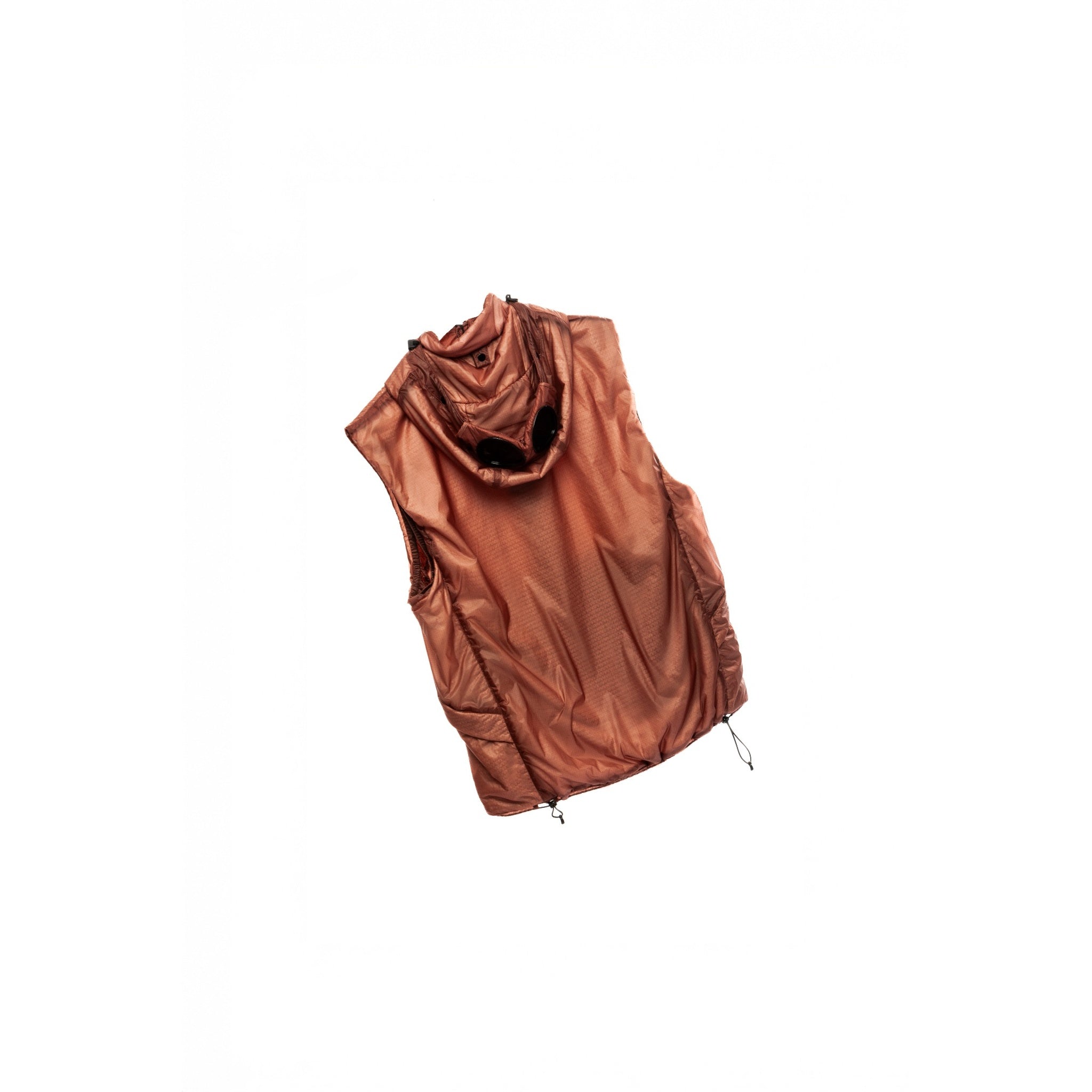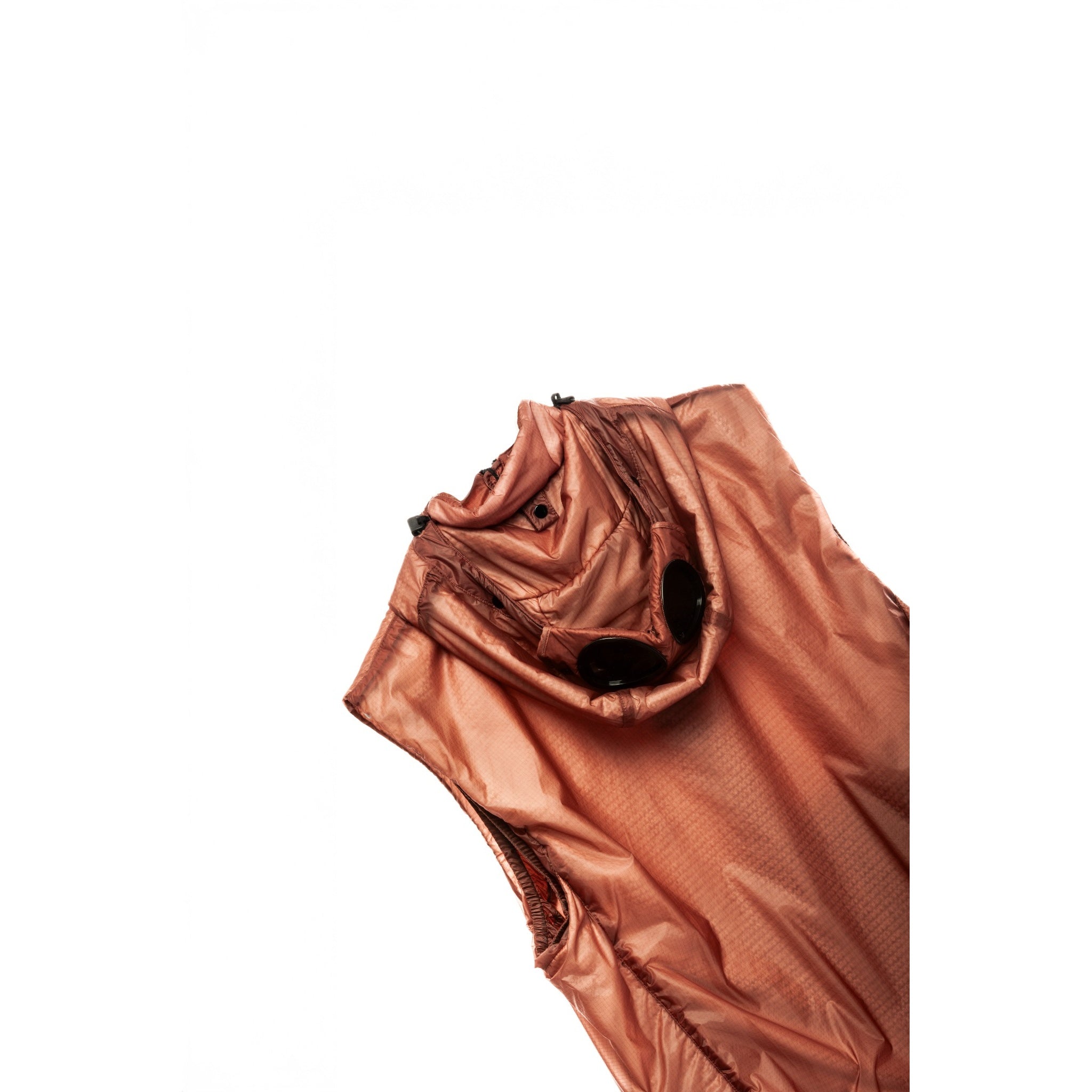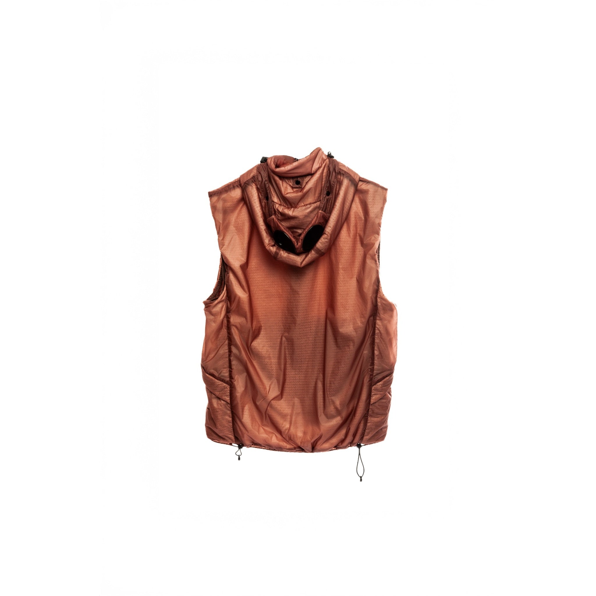 A standout C.P. Company goggle vest in a rare burnt orange tone, crafted from lightweight and durable nylon with Primaloft® padding. The iconic goggle hood design delivers the perfect balance of utility and bold streetwear aesthetics. Featuring a full-zip front closure, two slanted zip pockets, and a subtle lens detail on the hood. A highly functional and collectible layering piece from C.P. Company, ideal for all-season wear.