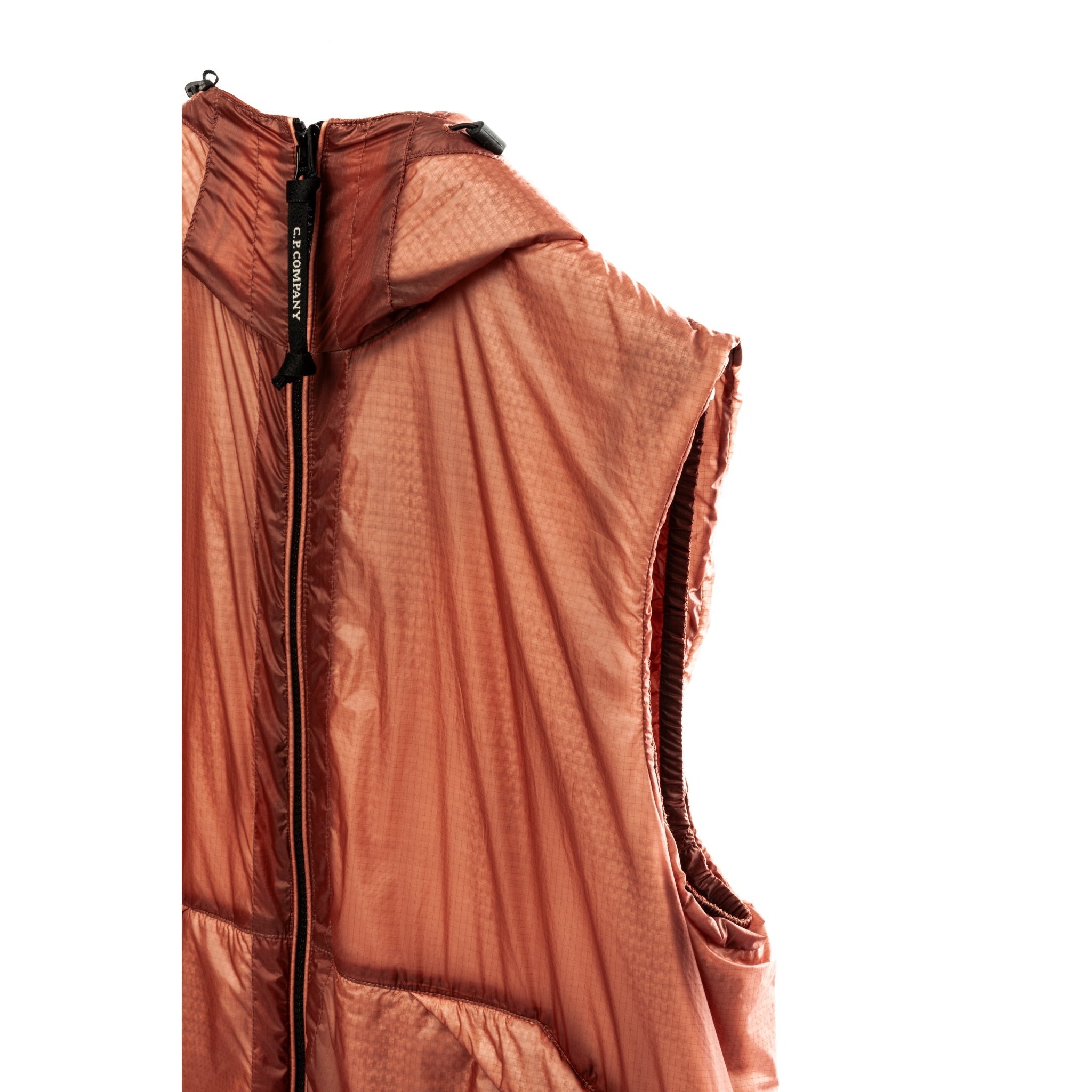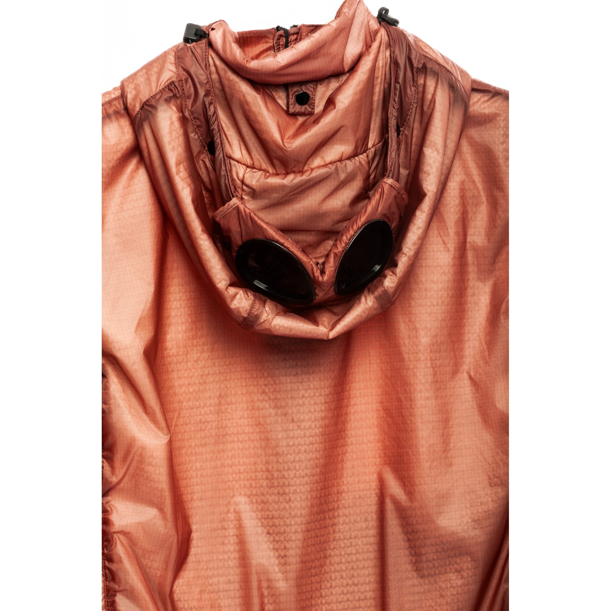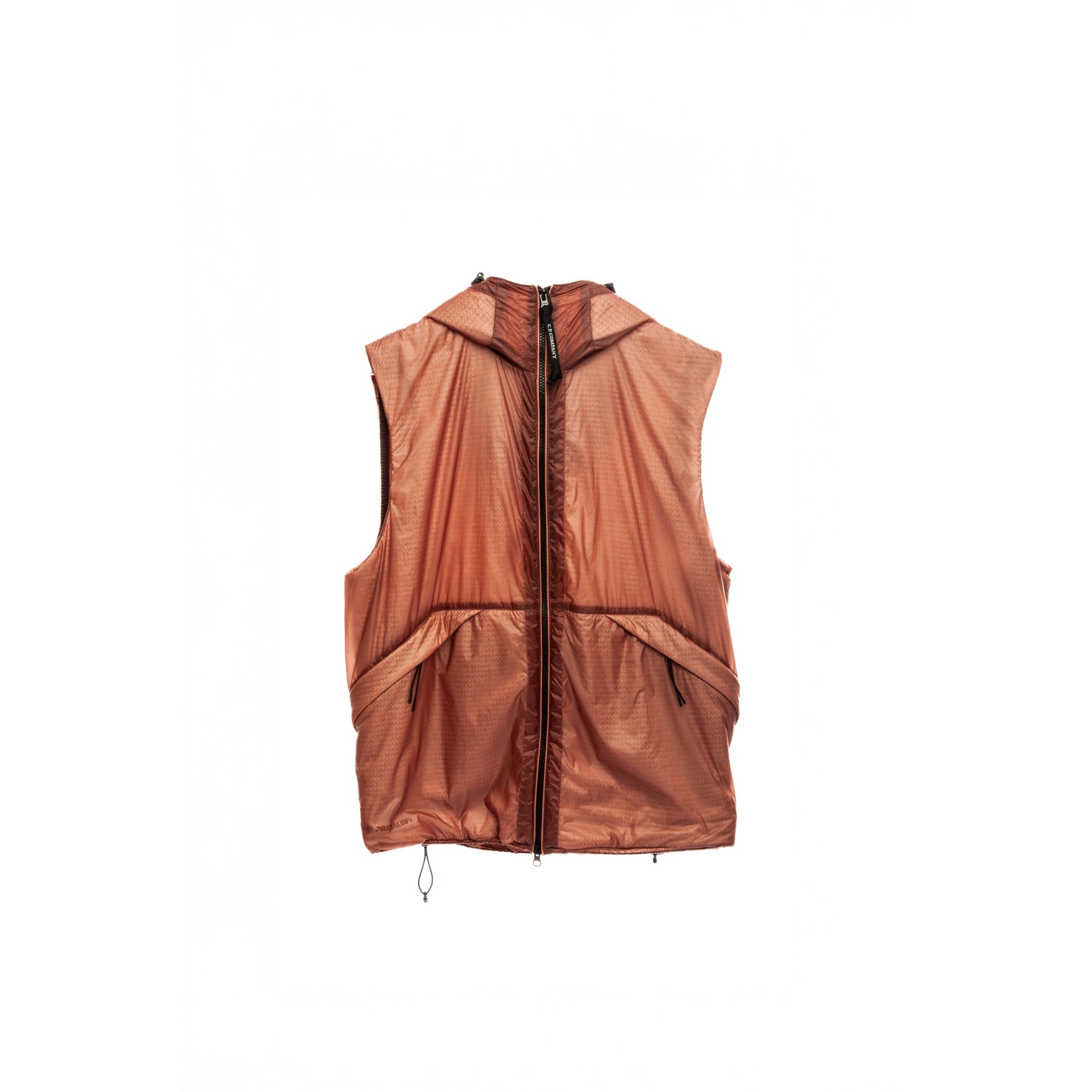 A standout C.P. Company goggle vest in a rare burnt orange tone, crafted from lightweight and durable nylon with Primaloft® padding. The iconic goggle hood design delivers the perfect balance of utility and bold streetwear aesthetics. Featuring a full-zip front closure, two slanted zip pockets, and a subtle lens detail on the hood. A highly functional and collectible layering piece from C.P. Company, ideal for all-season wear.